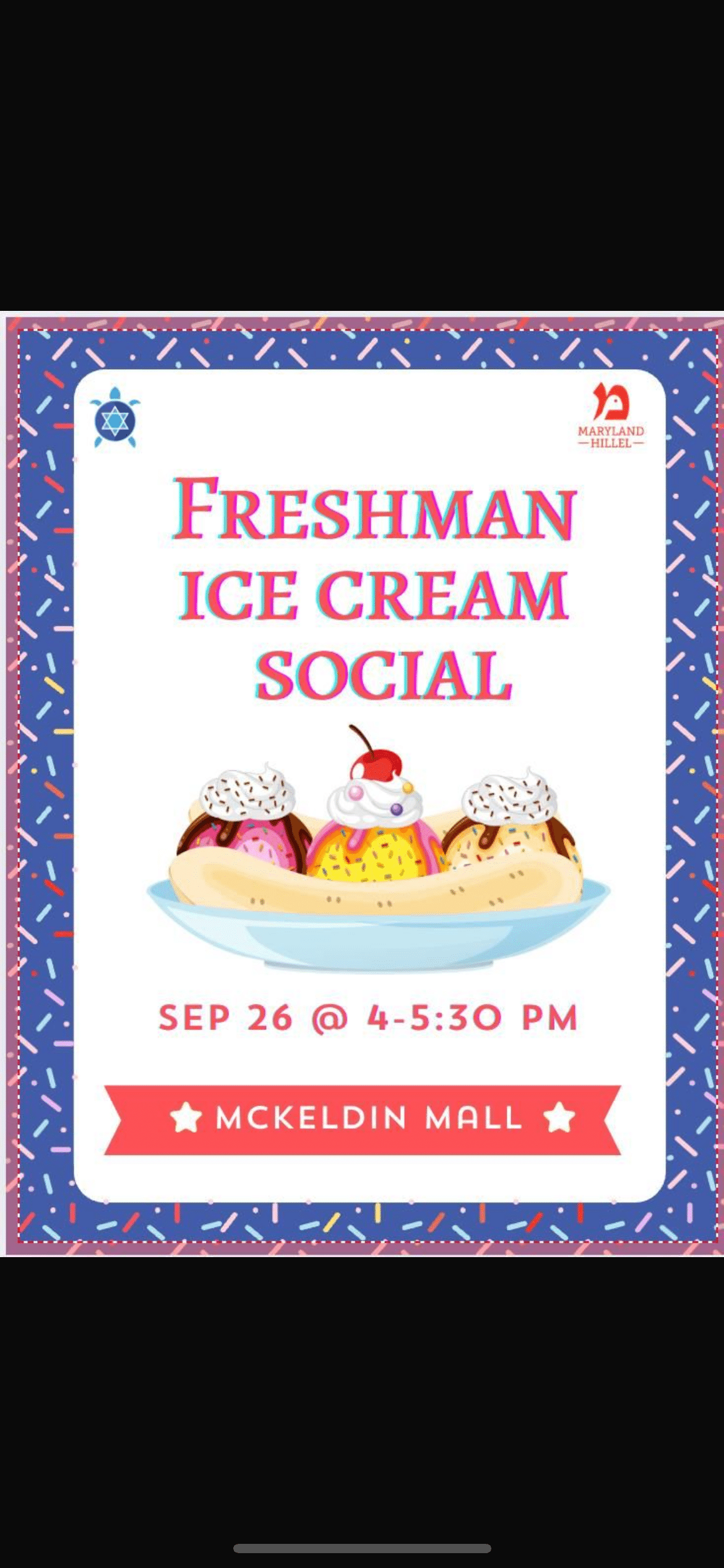 4:00 pm - 5:30 pm Freshman Ice Cream Social September 26 @ 4:00 pm - 5:30 pm Freshman Ice Cream Social McKeldin Mall Ice cream social for freshman at Mckeldin Mall! Join us on Friday, September 26th, before Shabbat, for ice cream!