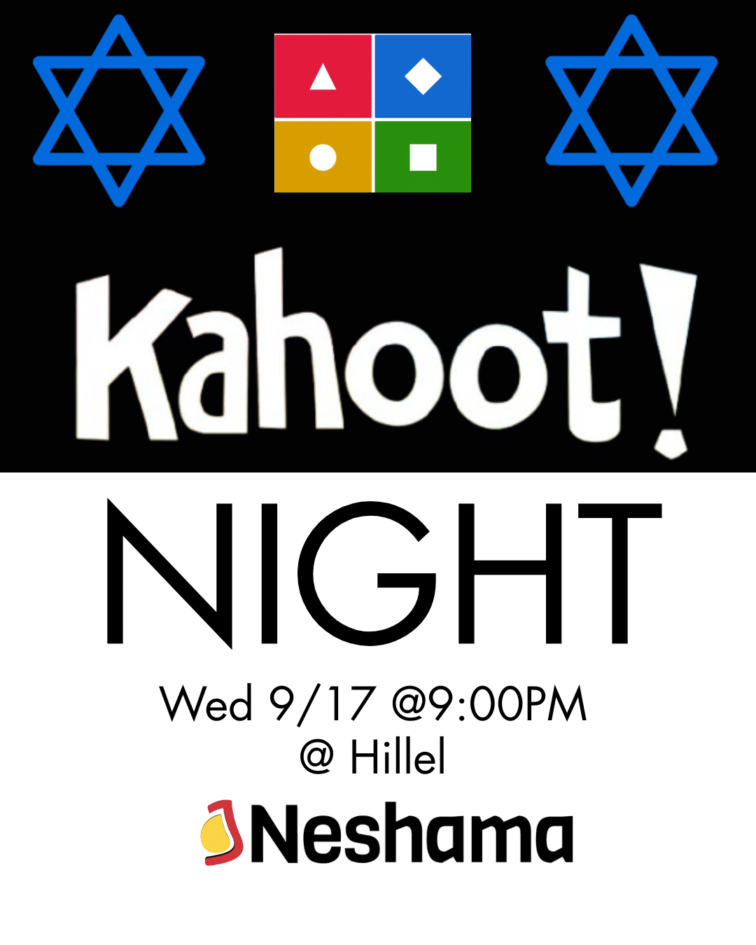 9:00 pm - 10:00 pm Kahoot! Night September 17 @ 9:00 pm - 10:00 pm Kahoot! Night Conference Room, Game Room, Multi-Purpose Room Come compete against your fellow Neshamaheads in a series of Kahoots covering several topics. Fill out this form to help us create the Kahoots: https://forms.gle/9KgcMxXLFeXfQYyk9